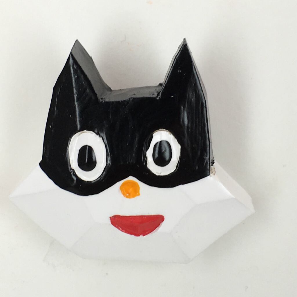 material:米ヒバ材、アクリルペイント、ニス仕上げ、バッチ金具、台紙付き袋入り