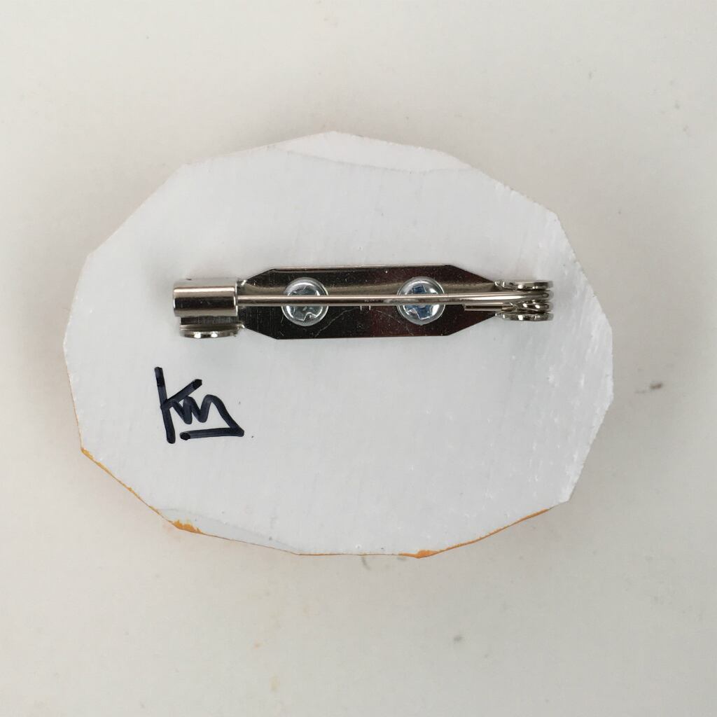 material:米ヒバ材、アクリルペイント、ニス仕上げ、バッチ金具、台紙付き袋入り