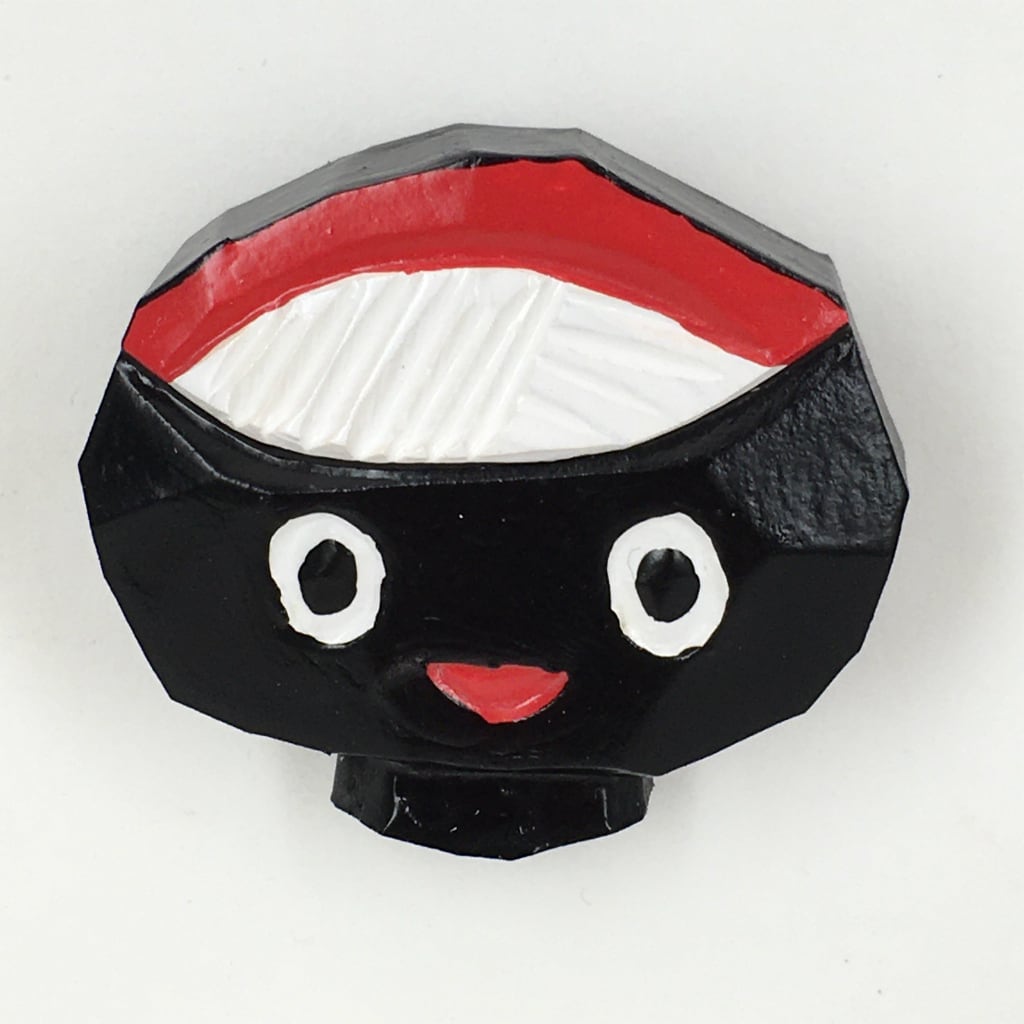 material:米ヒバ材、アクリルペイント、ニス仕上げ、バッチ金具、台紙付き袋入り