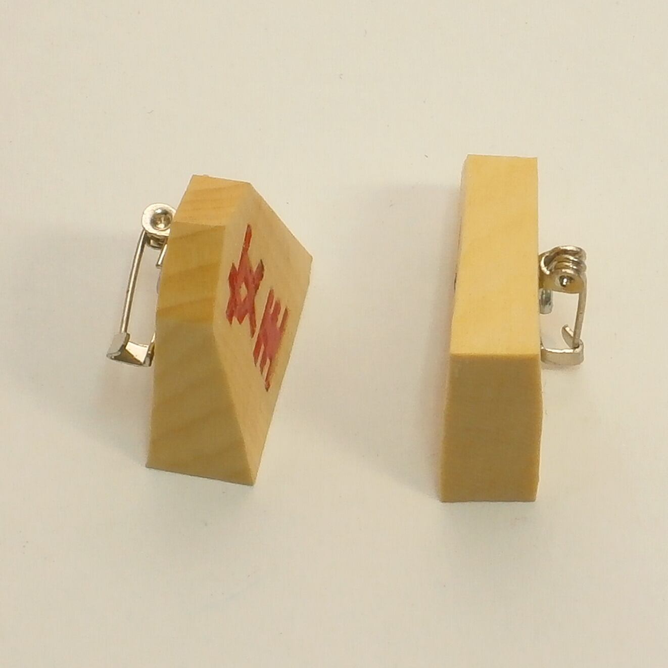 material:米ヒバ材、アクリルペイント、ニス仕上げ、バッチ金具、台紙付き袋入り