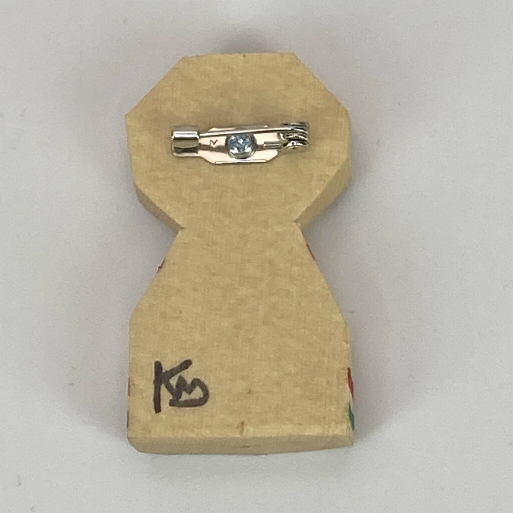 material:米ヒバ材、アクリルペイント、ニス仕上げ、バッチ金具、台紙付き袋入り